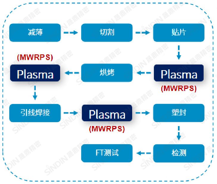 在倒裝芯片封裝,倒裝芯片的錫球與基板焊墊對(duì)接后,清洗完助焊劑后,依然需對(duì)芯片和基板之間進(jìn)行等離子體清洗,清除表面有機(jī)沾污及進(jìn)行表面再活化,使在灌膠(underfill)時(shí),可以大大提高膠的流動(dòng)性,使膠能完全覆滿在倒裝芯片和基板之間,不造成空洞,減少填料的損耗,提高了密合強(qiáng)度,降低加熱時(shí)產(chǎn)生孔洞,提高產(chǎn)品可靠性和壽命。